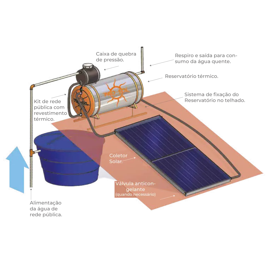 O sistema funciona através de um coletor solar que capta a radiação solar e transfere essa energia para os tubos, aquecendo a água. Nos dias ensolarados, a água aquecida é armazenada em um reservatório térmico e pode ser utilizada para banhos, desligando o chuveiro elétrico e economizando energia