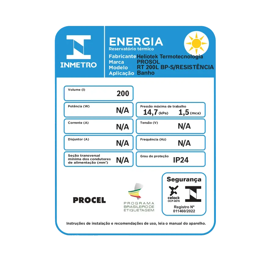 200 litros da mais alta eficiência térmica, mesmo em dias frios, armazena e fornece água quente para banho.